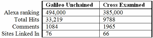 So what’s next? I’m thinking about podcasting the blogs. That is, the same content, just spoken. I hope that will provide a new audience. I’m also thinking about consolidating the blogs, which would mean focusing on Cross Examined and no longer updating or creating links to Galileo Unchained. (Your thoughts on these changes?)